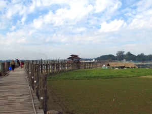 Mais plus encore que le centre et les payas, Mandalay attire les visiteurs pour ses anciennes cités en périphérie de la ville. Amarapura, Sagaing, Innwa… Il est très facile de trouver un taxi pour la journée et voir un maximum de choses, mais pour notre dernier jour de visite, on préfère y aller à notre rythme, quitte à passer à côté de plein de trucs. C’est ça aussi les voyages, se laisser porter et faire des choix ! On peut trouver plusieurs « pick-ups » dans Mandalay qui vont à Amarapura, c’est un peu plus long qu’en taxi, mais c’est moins cher et surtout beaucoup plus charmant (sauf pour nos pauvres fesses). LE truc à ne pas manquer à Amarapura, c’est le U Bein bridge, un grand pont en teck qui serpente au-dessus d’un lac entouré de champs où travaillent quelques Birmans. C’est un endroit pris d’assaut au coucher du soleil, mais on a préféré le traverser (relativement) tranquillement le matin.