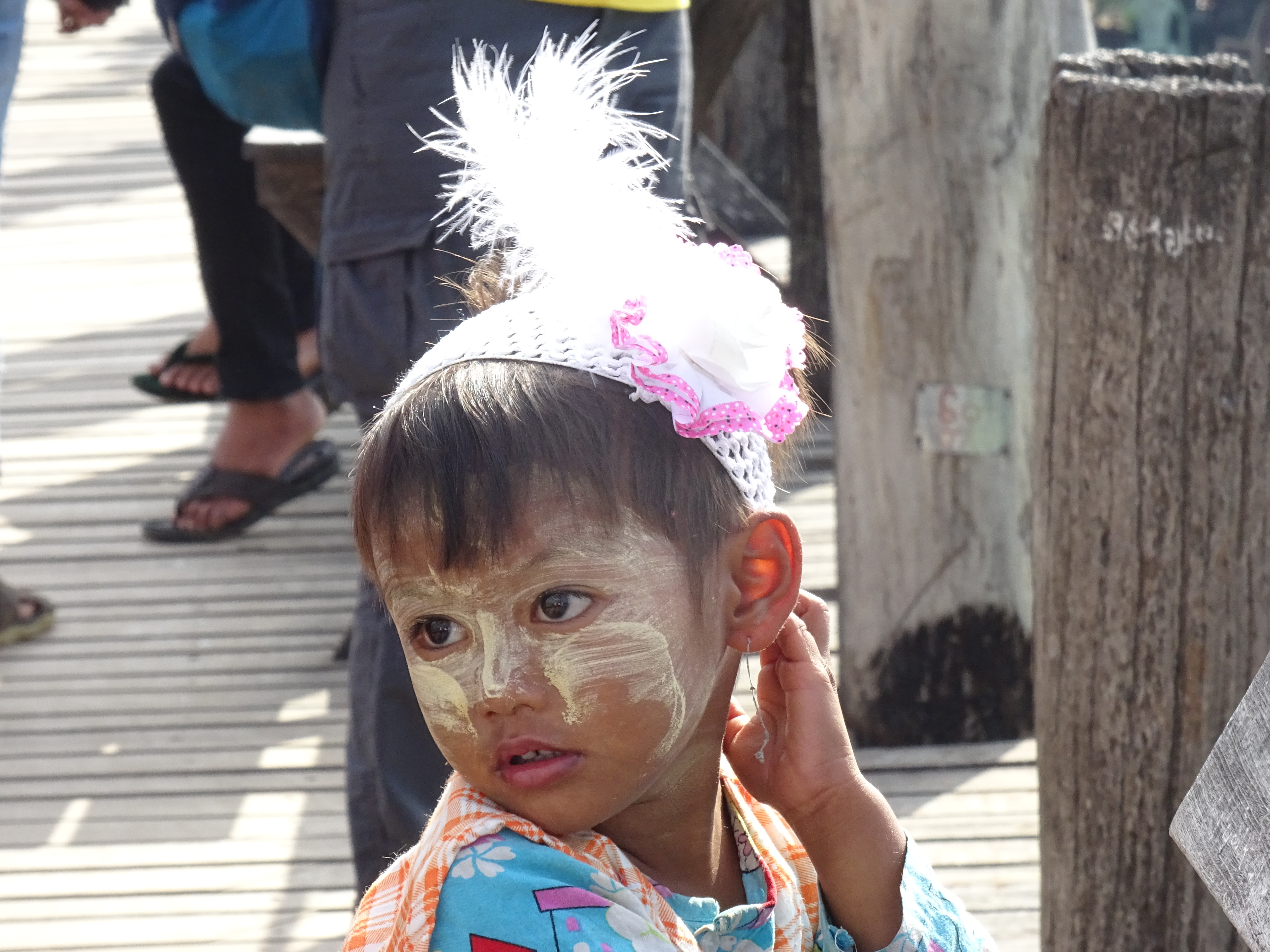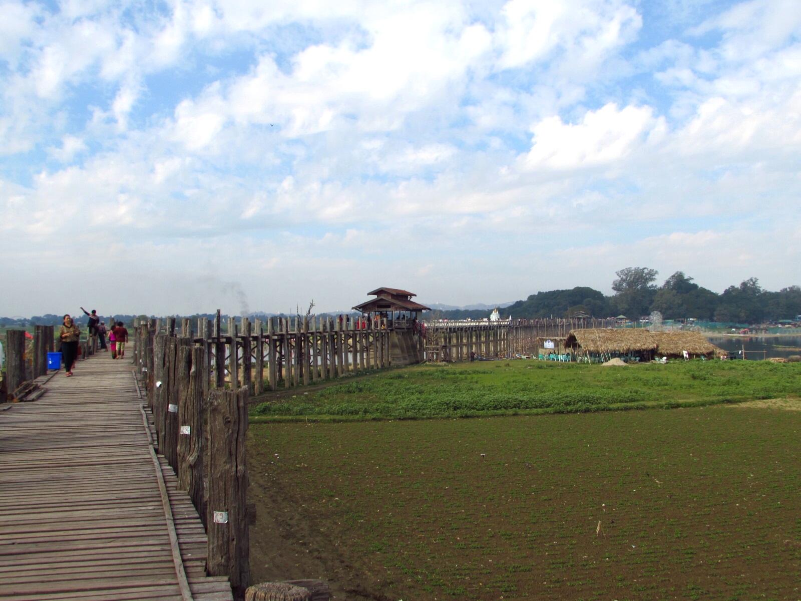 Mais plus encore que le centre et les payas, Mandalay attire les visiteurs pour ses anciennes cités en périphérie de la ville. Amarapura, Sagaing, Innwa… Il est très facile de trouver un taxi pour la journée et voir un maximum de choses, mais pour notre dernier jour de visite, on préfère y aller à notre rythme, quitte à passer à côté de plein de trucs. C’est ça aussi les voyages, se laisser porter et faire des choix ! On peut trouver plusieurs « pick-ups » dans Mandalay qui vont à Amarapura, c’est un peu plus long qu’en taxi, mais c’est moins cher et surtout beaucoup plus charmant (sauf pour nos pauvres fesses). LE truc à ne pas manquer à Amarapura, c’est le U Bein bridge, un grand pont en teck qui serpente au-dessus d’un lac entouré de champs où travaillent quelques Birmans. C’est un endroit pris d’assaut au coucher du soleil, mais on a préféré le traverser (relativement) tranquillement le matin.