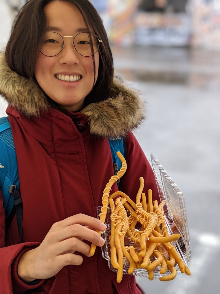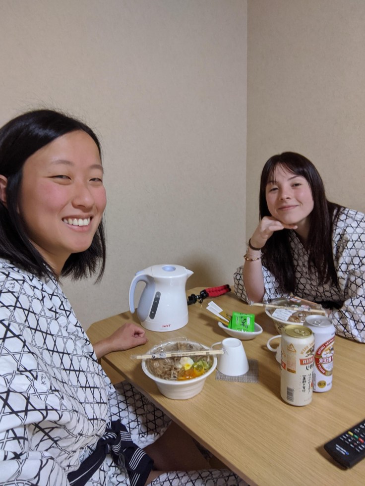 Le retour se fait sous une pluie battante, recroquevillées dans nos manteaux mais heureuses à l’intérieur. On s’arrête dans une des nombreuses petites supérettes 24h/24 qu’on trouve à tous les coins de rue pour prendre de quoi manger ce soir, car on sait déjà qu’on aura la flemme de ressortir (n’oublions pas qu’un onsen nous attend).