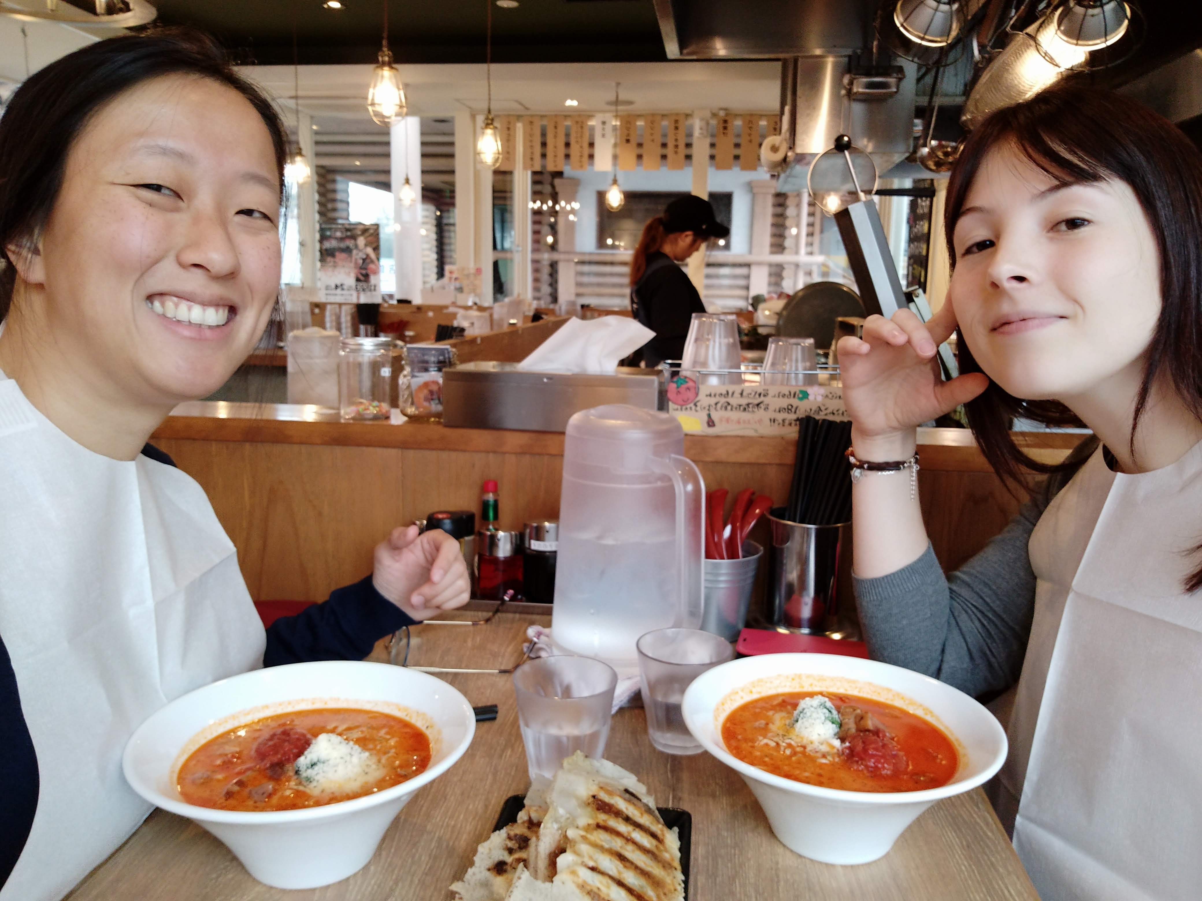 On a testé le Tomato Ramen qui, comme son nom l’indique à peu près, propose une cuisine fusion ramen – sauce tomate et parmesan… et c’est à tomber par terre. Une excellente surprise ! (Notez au passage nos mignons petits tabliers pour ne pas nous tâcher.)