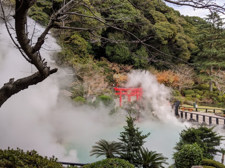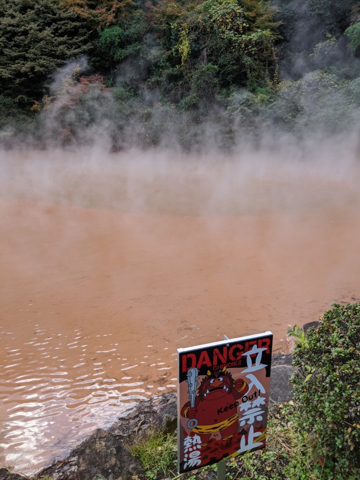 Je tenais beaucoup à cette destination, car clairement un des gros objectifs de ce voyage était de se faire de somptueux onsen ! La ville est connue pour son Jigoku Meguri (= tour des enfers), rien qu’au nom ça donne envie n’est-ce-pas ? La ville est en fait composée de nombreuses sources d’eau chaudes qui émanent de la fumée et une bonne odeur de souffre ! Nombreuses de ces sources sont tellement chaudes qu’on ne peut pas s’y baigner, mais les locaux cuisinent avec, c’est le cas du Jigoku Meguri qui est composé de 7 sources chaudes avoisinant les 100°C !