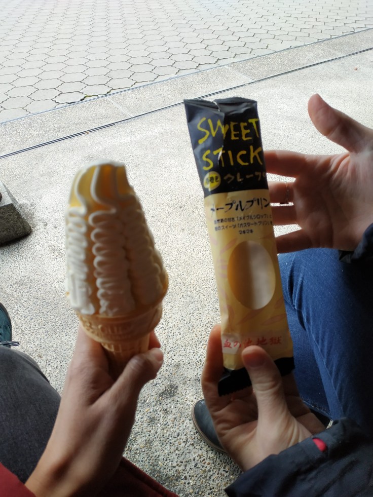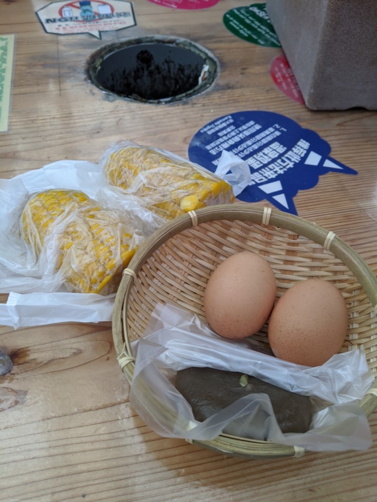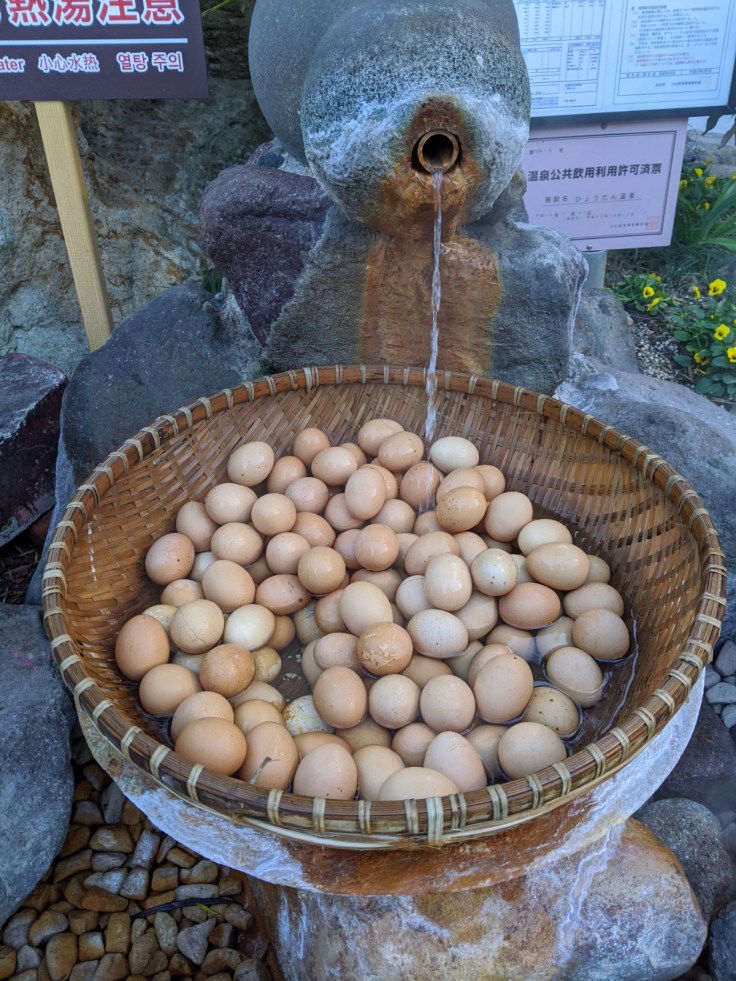 L’eau est si chaude qu’ils y font cuire des œufs… Aah, les fameux œufs cuits dans les sources de Beppu font partie de l’attrait touristique de la ville (les Japonais aiment bien avoir une spécialité bien précise par ville ou par région, un truc qu’il faut absolument goûter et rapporter ensuite à ses proches en souvenir) (nous on a juste tout goûté sur place par contre, désolée).