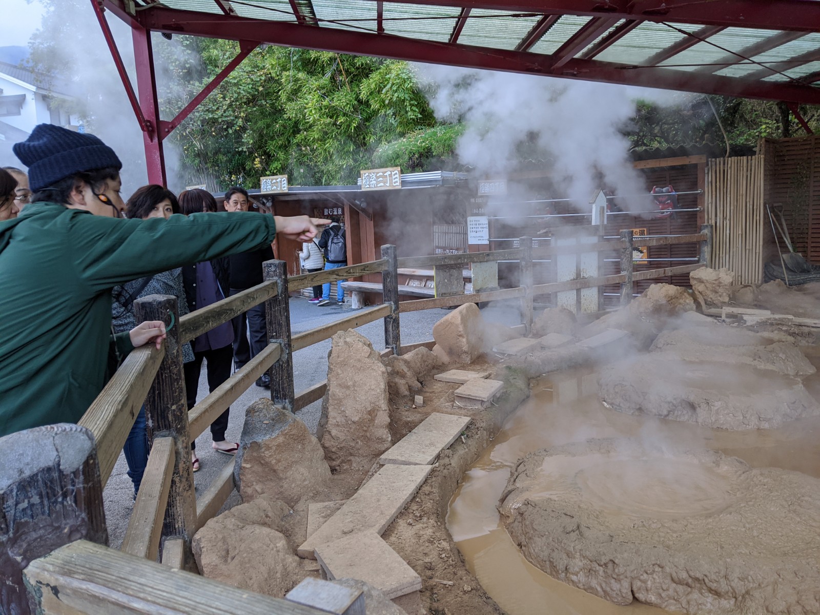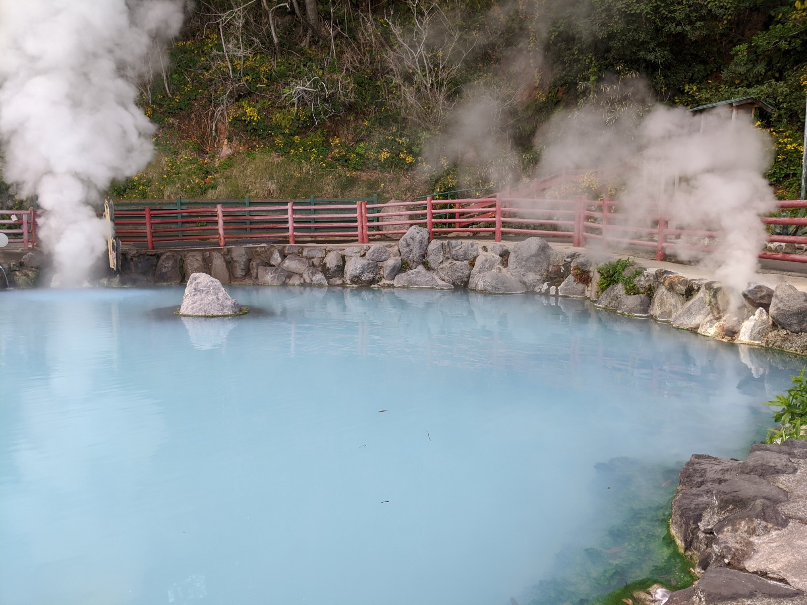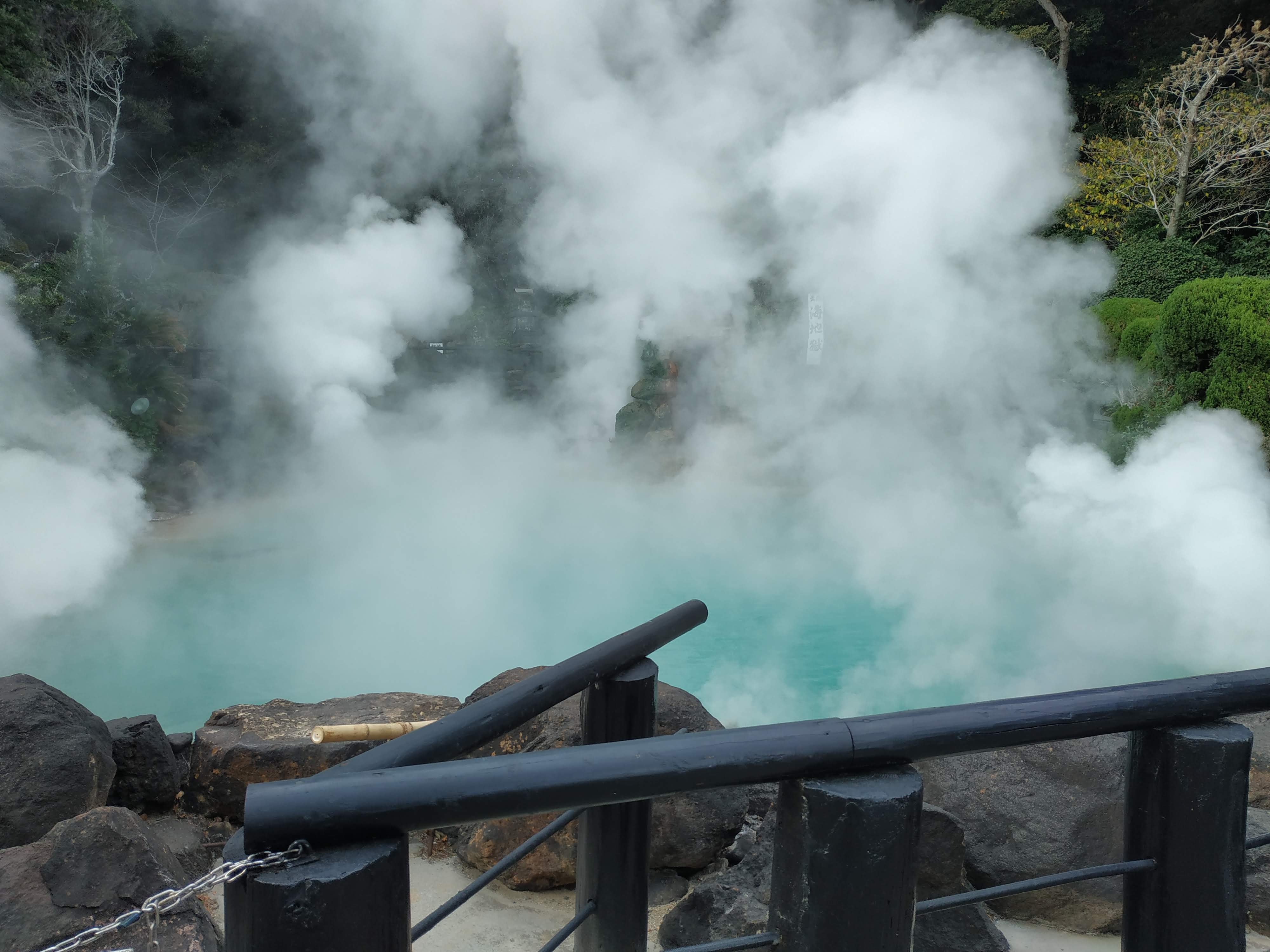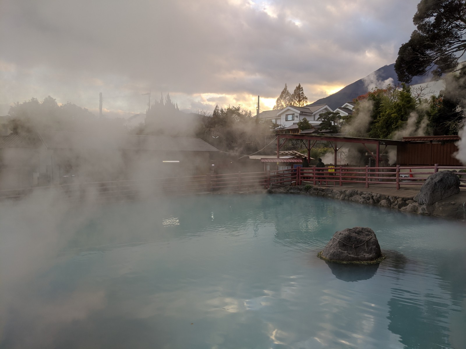Je tenais beaucoup à cette destination, car clairement un des gros objectifs de ce voyage était de se faire de somptueux onsen ! La ville est connue pour son Jigoku Meguri (= tour des enfers), rien qu’au nom ça donne envie n’est-ce-pas ? La ville est en fait composée de nombreuses sources d’eau chaudes qui émanent de la fumée et une bonne odeur de souffre ! Nombreuses de ces sources sont tellement chaudes qu’on ne peut pas s’y baigner, mais les locaux cuisinent avec, c’est le cas du Jigoku Meguri qui est composé de 7 sources chaudes avoisinant les 100°C !