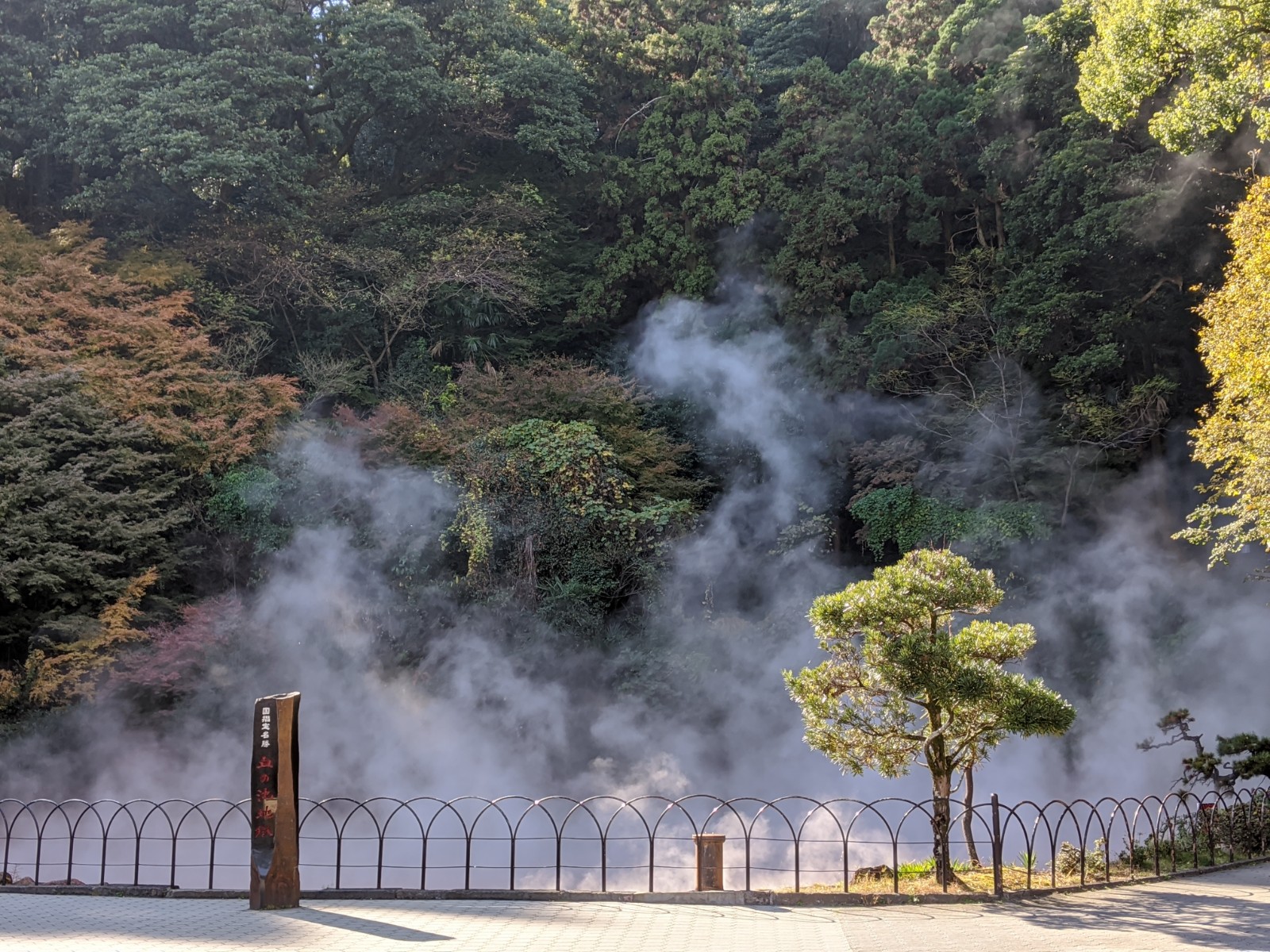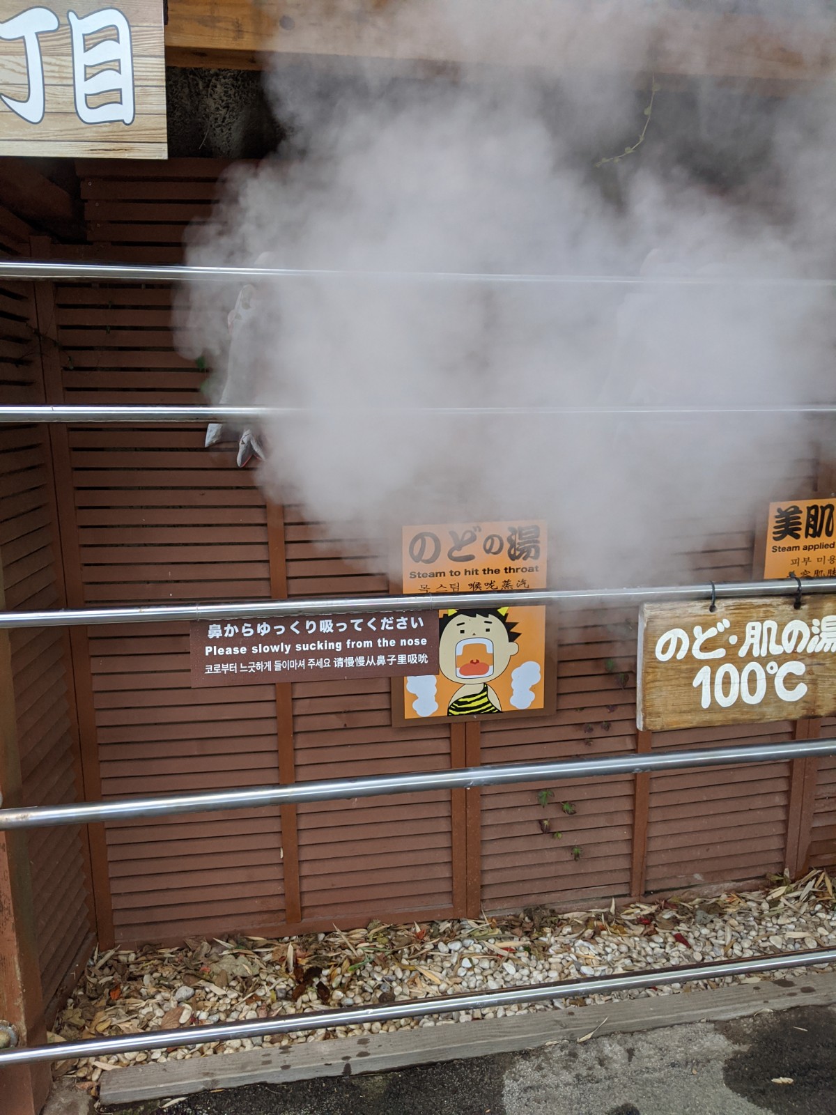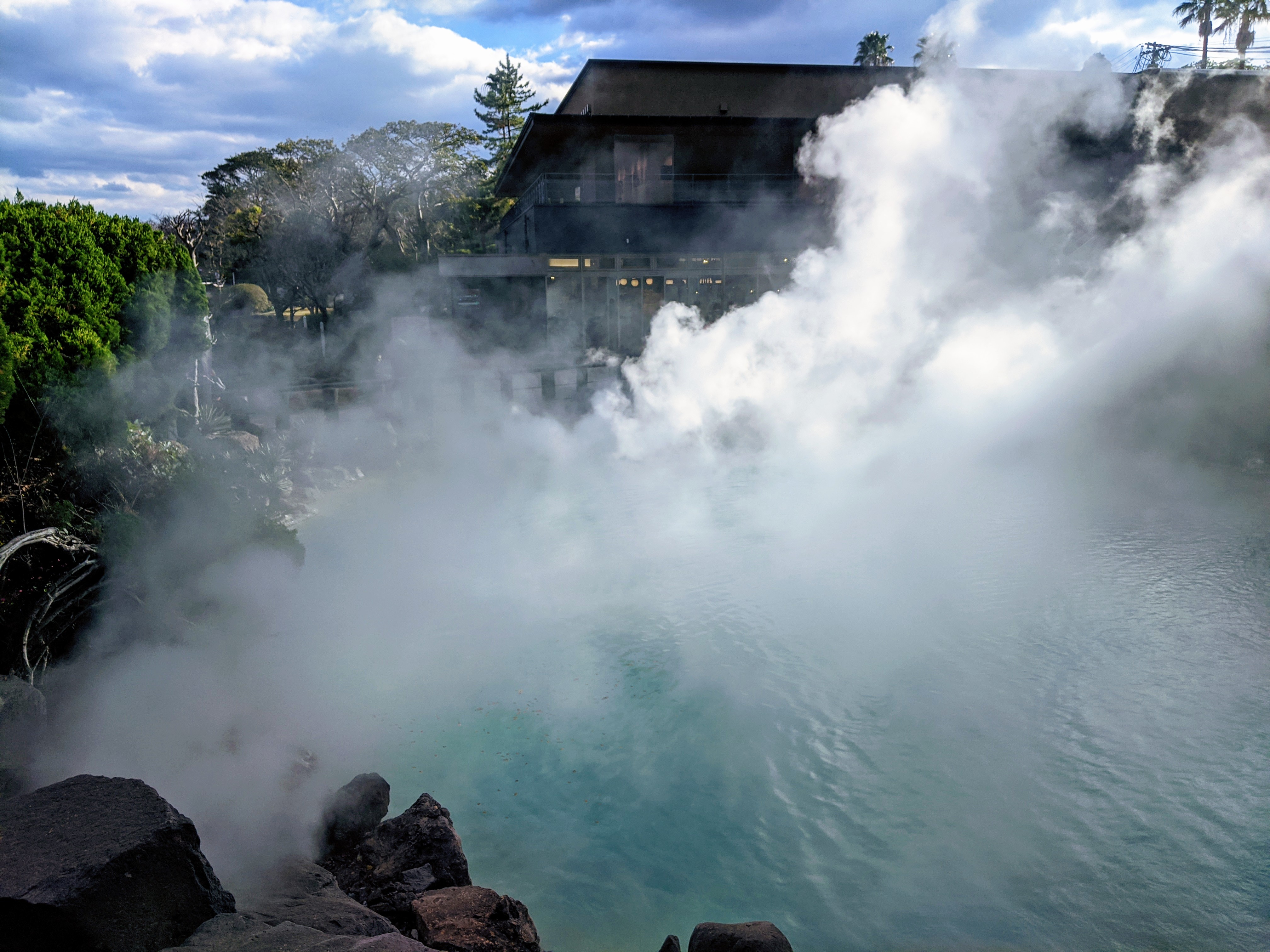 Je tenais beaucoup à cette destination, car clairement un des gros objectifs de ce voyage était de se faire de somptueux onsen ! La ville est connue pour son Jigoku Meguri (= tour des enfers), rien qu’au nom ça donne envie n’est-ce-pas ? La ville est en fait composée de nombreuses sources d’eau chaudes qui émanent de la fumée et une bonne odeur de souffre ! Nombreuses de ces sources sont tellement chaudes qu’on ne peut pas s’y baigner, mais les locaux cuisinent avec, c’est le cas du Jigoku Meguri qui est composé de 7 sources chaudes avoisinant les 100°C !
