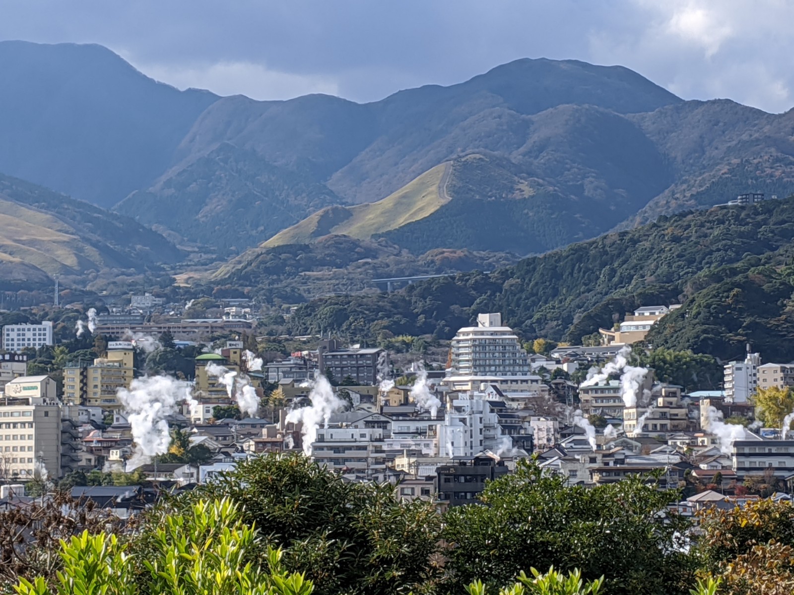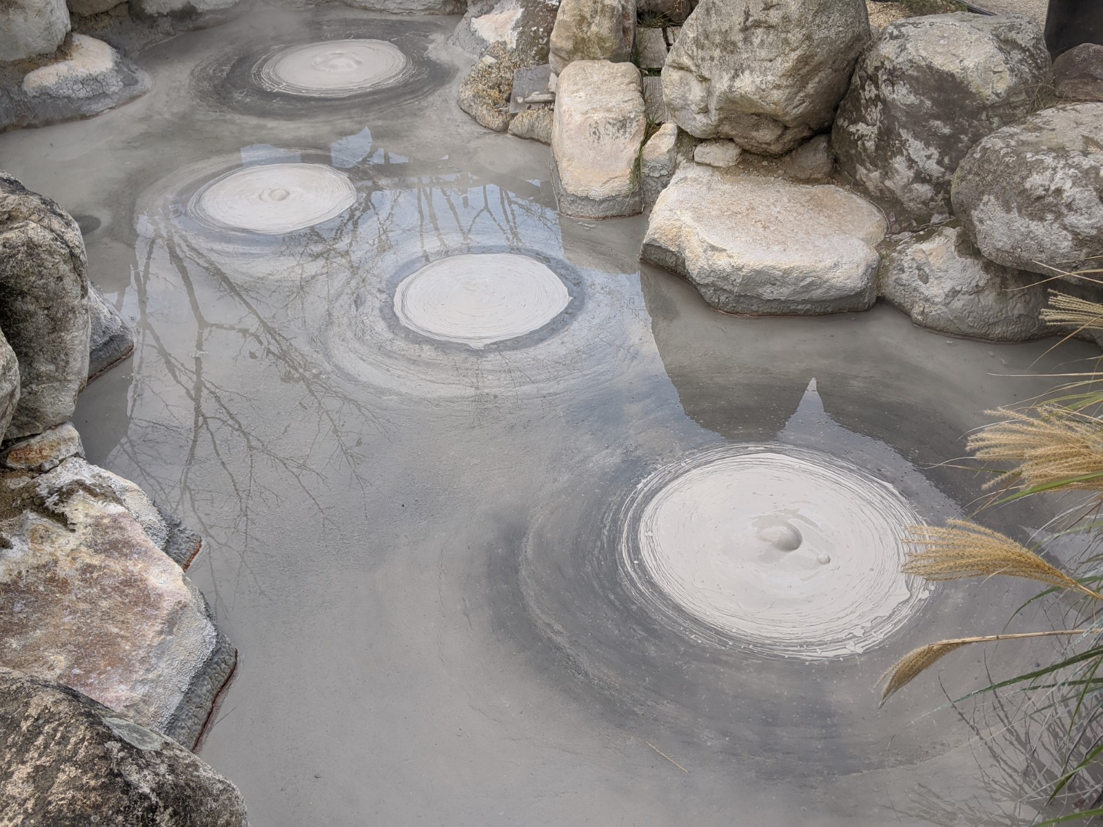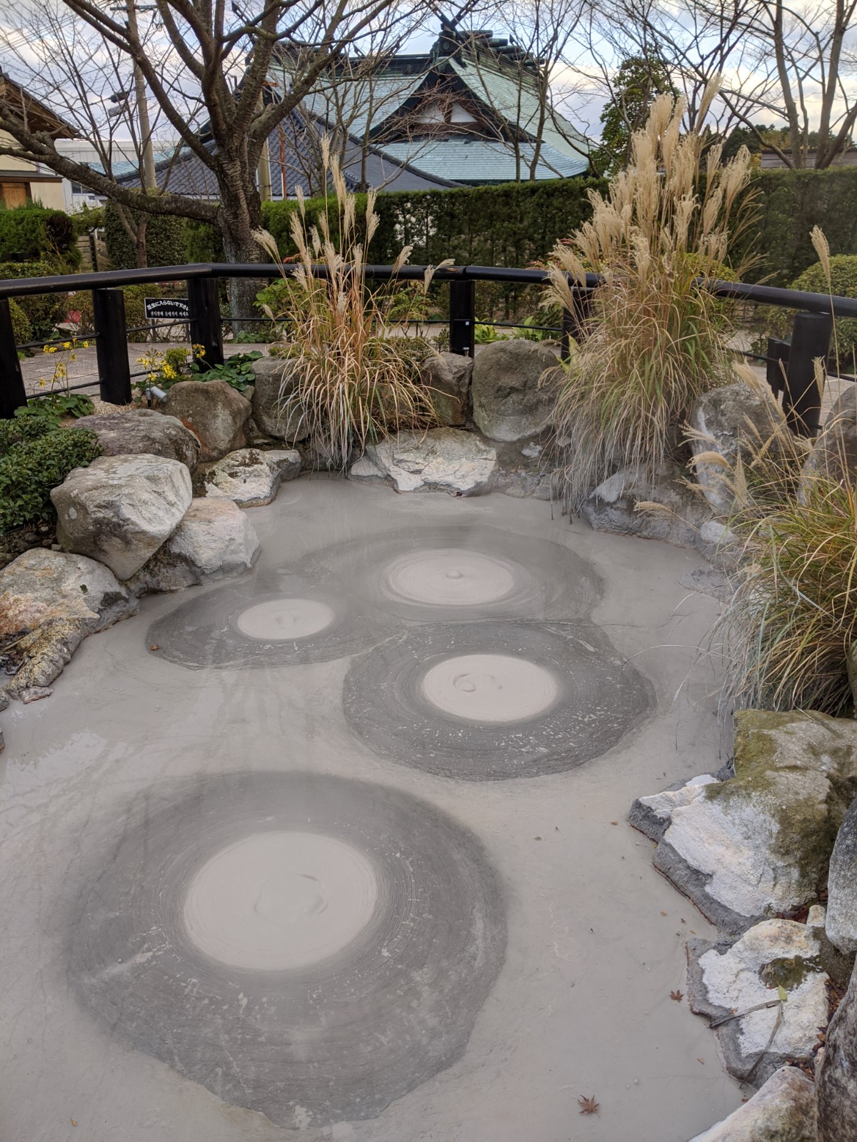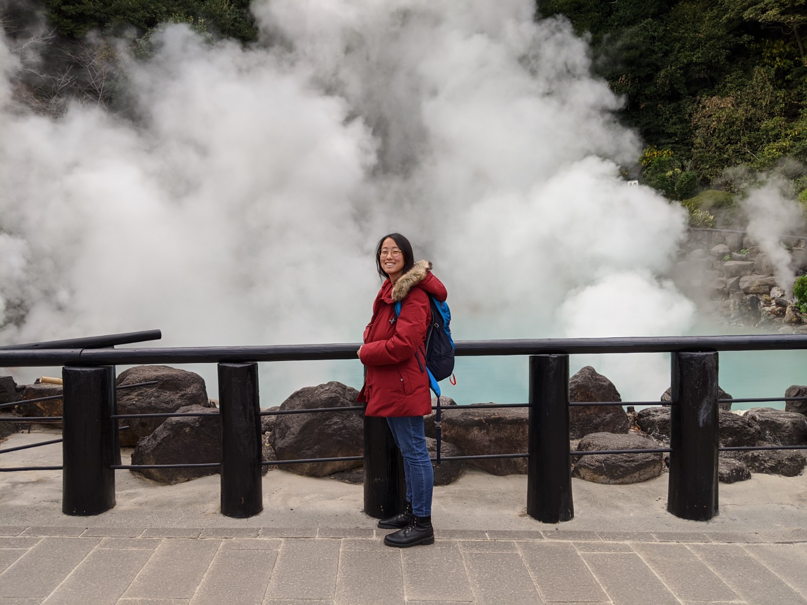 Je tenais beaucoup à cette destination, car clairement un des gros objectifs de ce voyage était de se faire de somptueux onsen ! La ville est connue pour son Jigoku Meguri (= tour des enfers), rien qu’au nom ça donne envie n’est-ce-pas ? La ville est en fait composée de nombreuses sources d’eau chaudes qui émanent de la fumée et une bonne odeur de souffre ! Nombreuses de ces sources sont tellement chaudes qu’on ne peut pas s’y baigner, mais les locaux cuisinent avec, c’est le cas du Jigoku Meguri qui est composé de 7 sources chaudes avoisinant les 100°C !