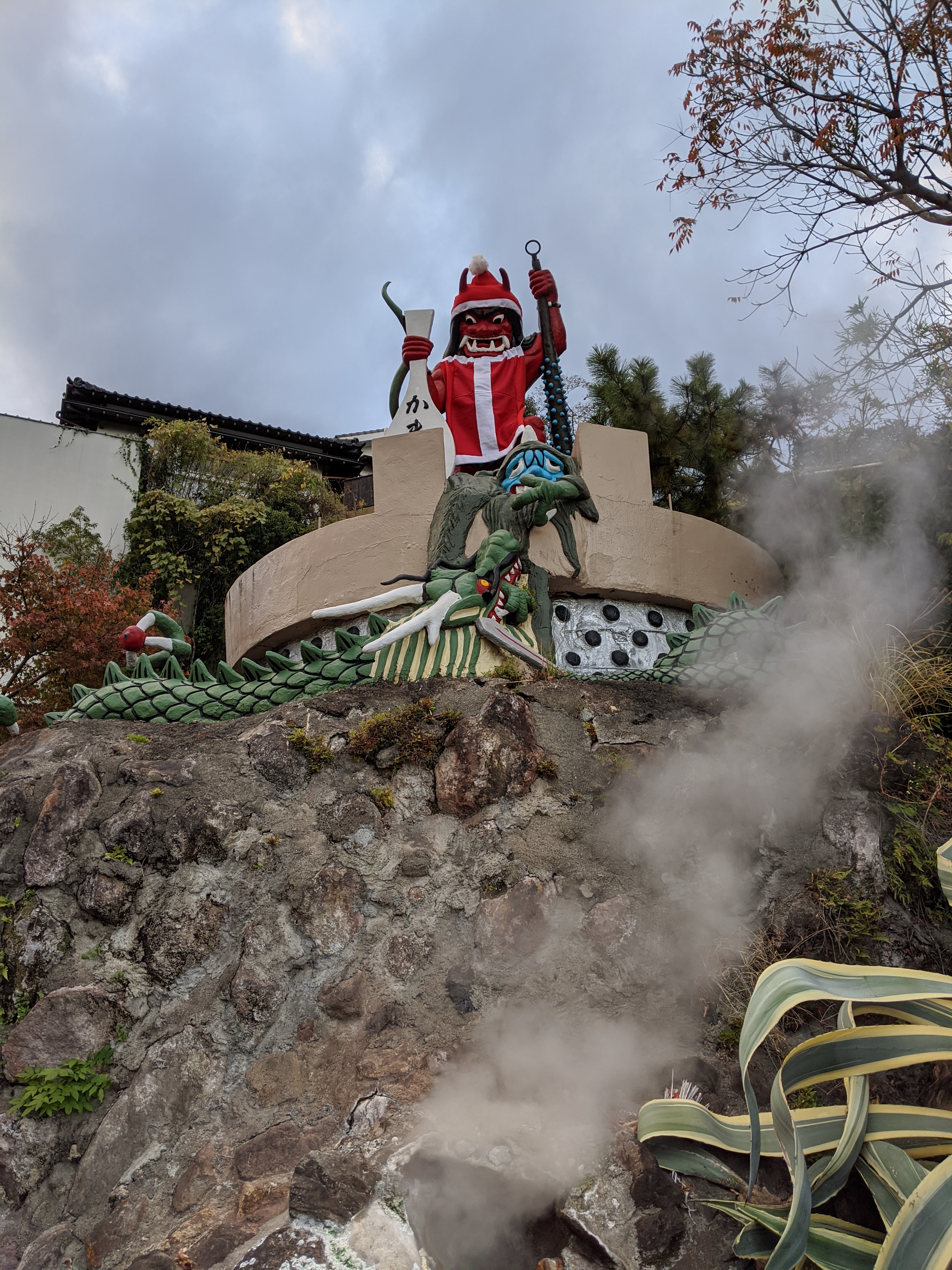 Bon, c’est bien beau tout ça, mais ne manquerait-il pas quelque chose à cette visite de Beppu, ville réputée pour ses sources chaudes ? Mais ouiiiiii, un onsen !