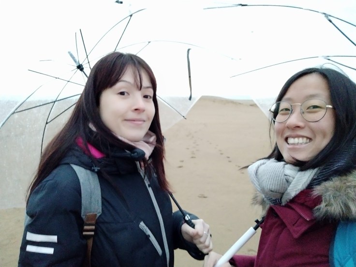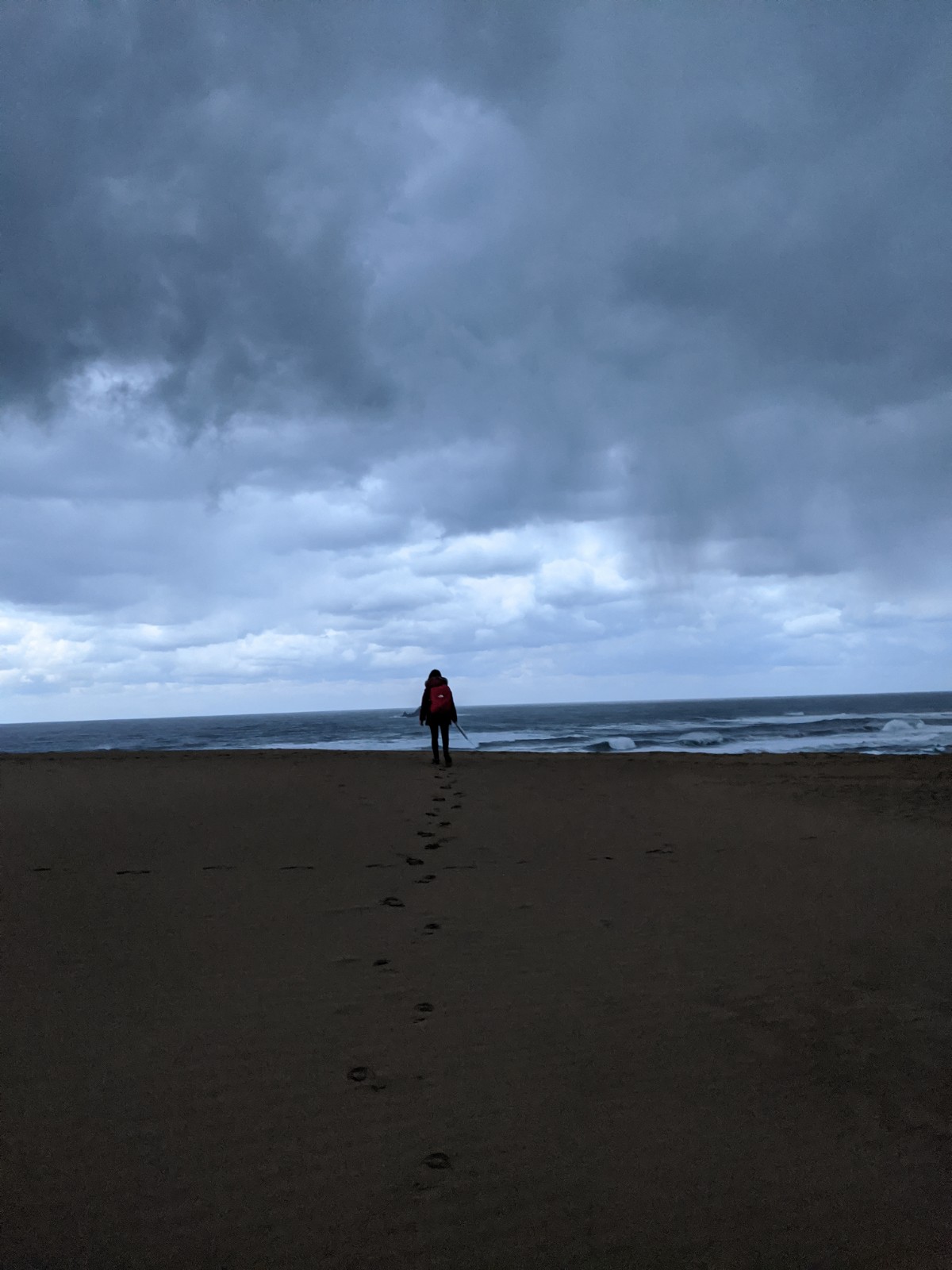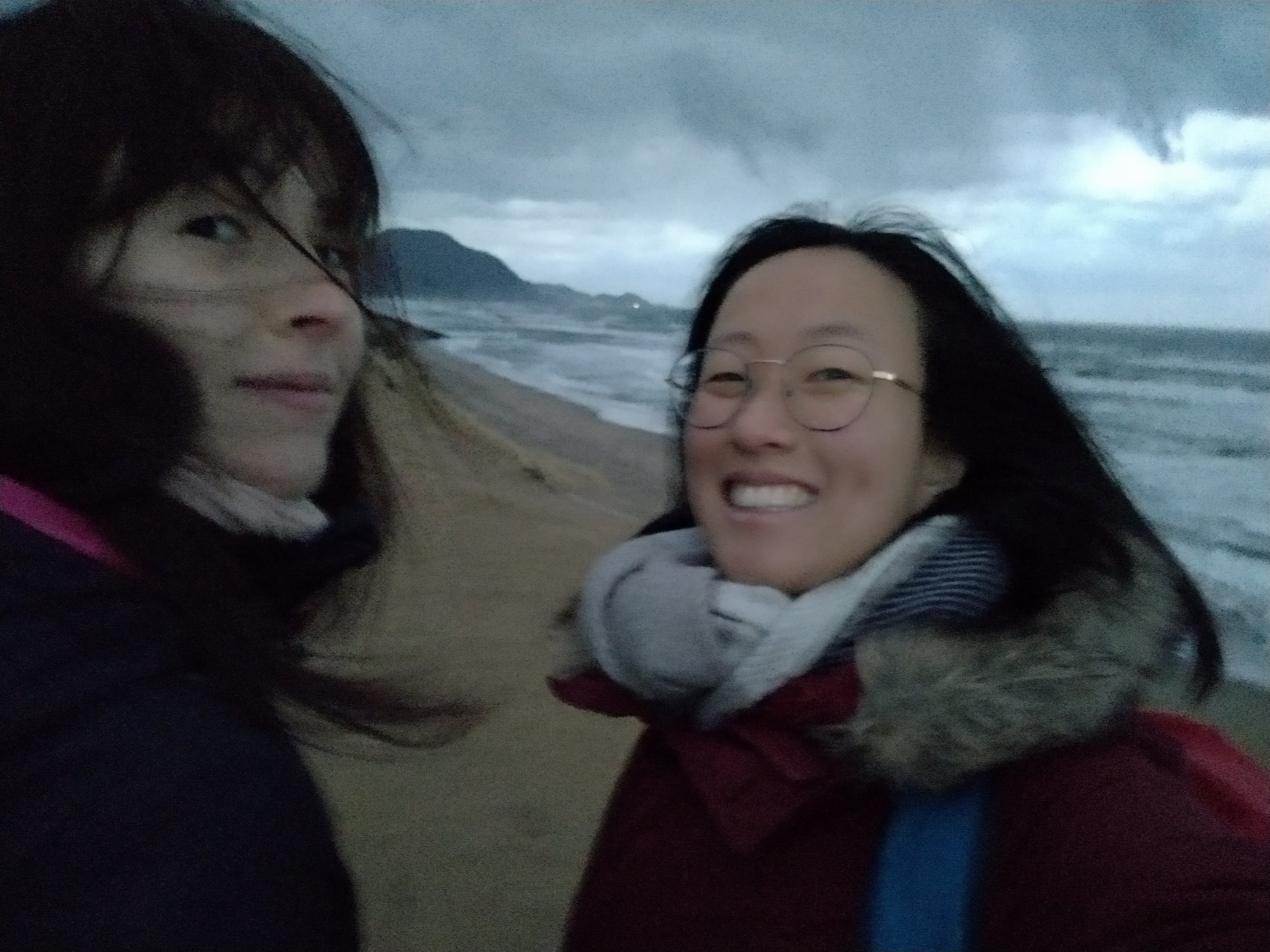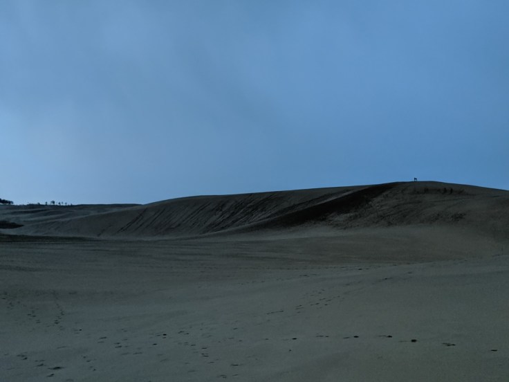 Fin d’après-midi, peu de lumière, météo peu clémente… Ah oui, c’est peut-être pour ça que nous sommes seules sur cette plage. Normalement il y a foule et d’après les photos des guides, il y aurait même des chameaux (aaah, le Japon).