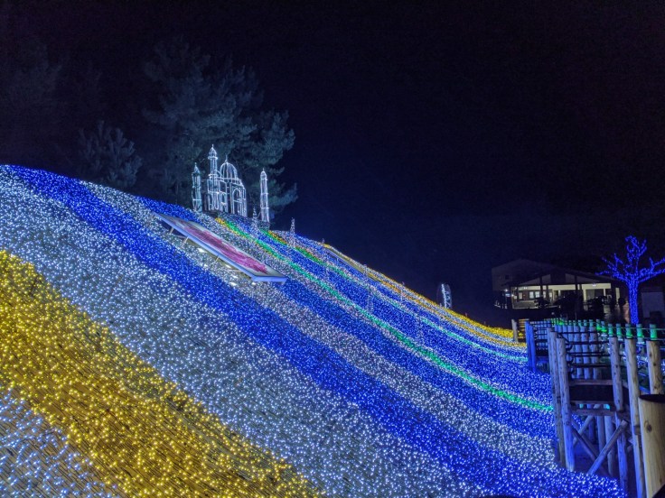 Bon allez, il fait nuit et on a eu notre dose de sable et de tempête. Repli ! On passe devant l’endroit où auront lieu les illuminations des dunes, mais on arrive un peu tôt en saison, elles ne sont pas toutes installées. On retourne bien vite au centre de Tottori se mettre au chaud… et à table, surtout.