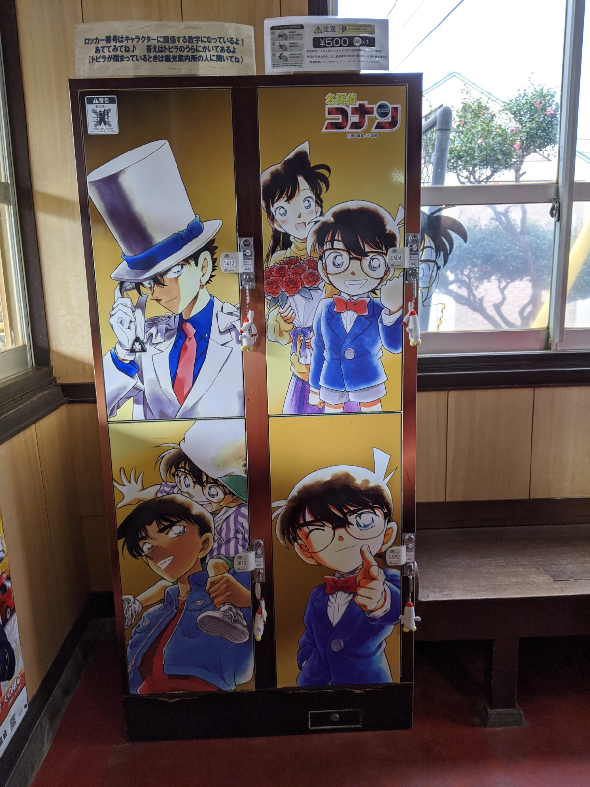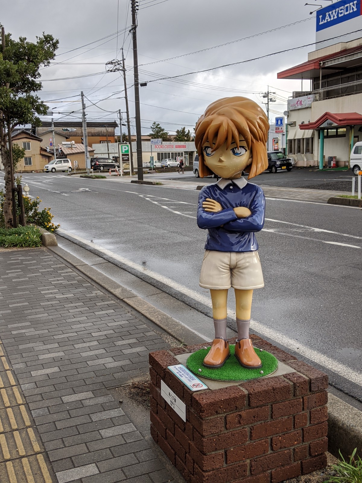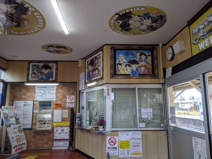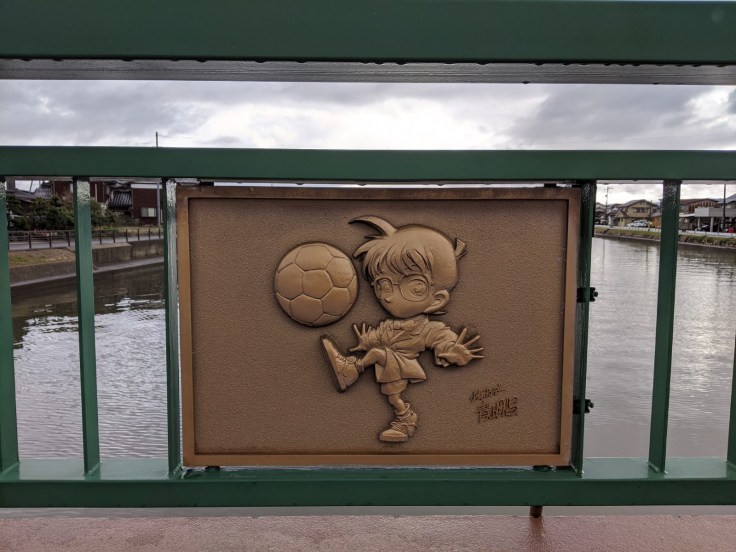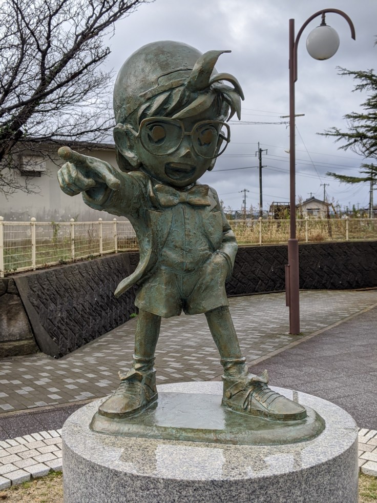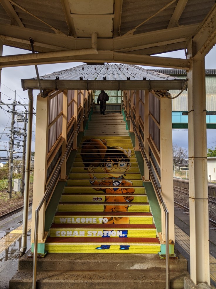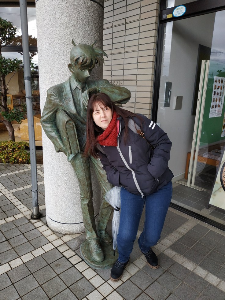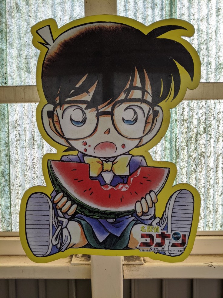 Nous avons pris un train partant de Tottori pour nous rendre à Hokuei, petite ville natale de Gosho Aoyama, auteur du manga Détective Conan ! Hokuei est également connue sous le nom de Conan Town. Après… y’a pas grand chose d’autre d’intéressant à Hokuei, à part ses cultivations d’ignames et de pastèques à priori !