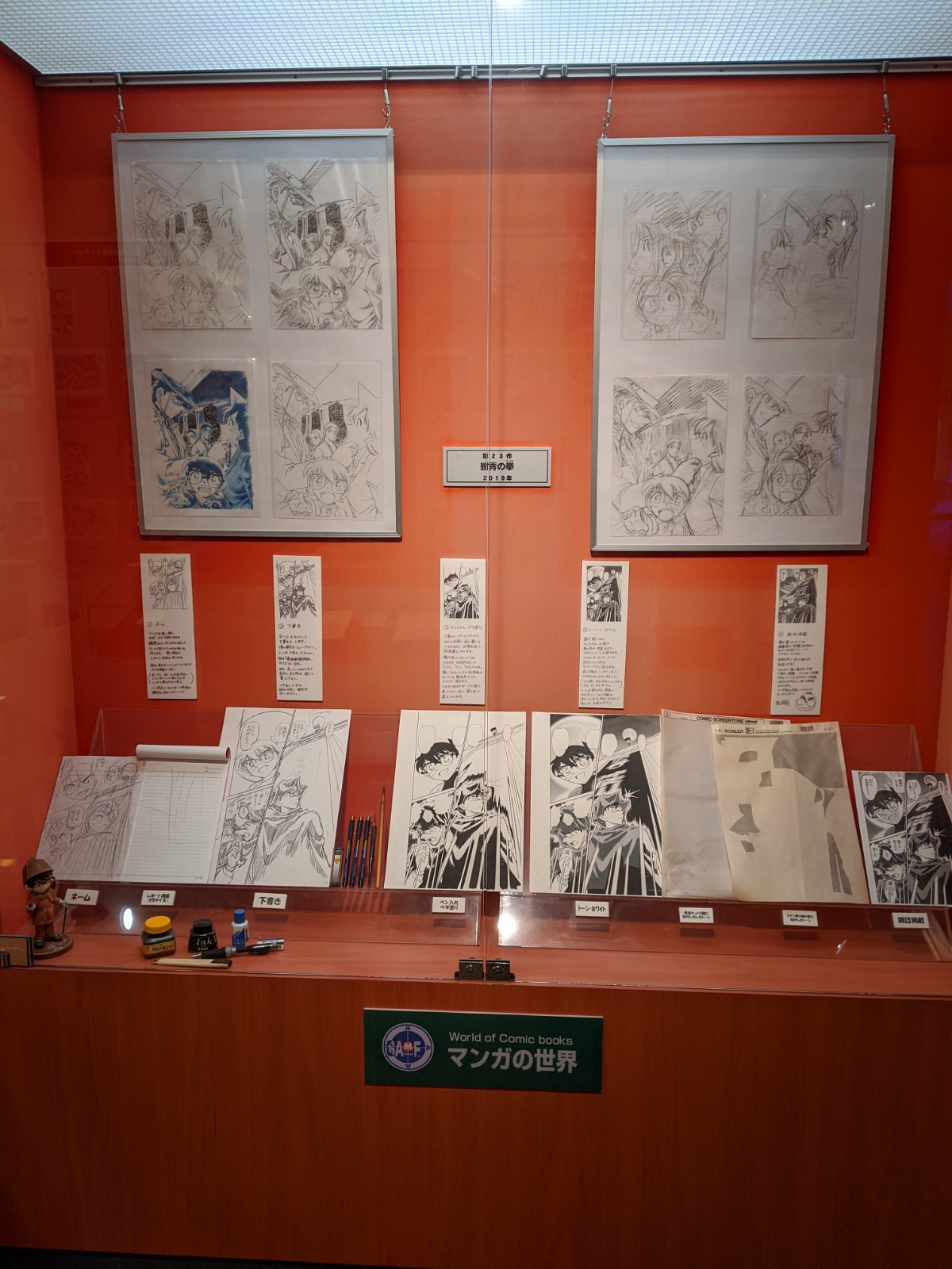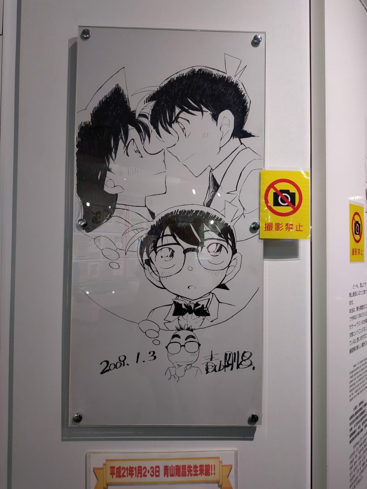 L’entrée du musée Gosho Aoyama Manga Factory nous coûte 700 yens chacune (moins de 6€) et nous commençons notre visite avec la présentation de l’auteur : photos d’enfance, ses premiers dessins quand il était enfant, puis adolescent, des cahiers d’école, etc. Une présentation rapide des différents mangas qu’il a fait avant Détective Conan (Chotto Mattete, Magic Kaito et Yaiba) nous visionnons même une vidéo récapitulatif de sa vie où les parents de l’auteur, ses anciens professeurs d’école et également Gosho Aoyama lui-même y sont interviewés ! Là on se dit que l’auteur est vraiment une caricature du mangaka, car dans les vidéos diffusées dans le musée, il est toujours en vieux survet’ et pas coiffé (cheveux un peu gras et dégarni) ^^