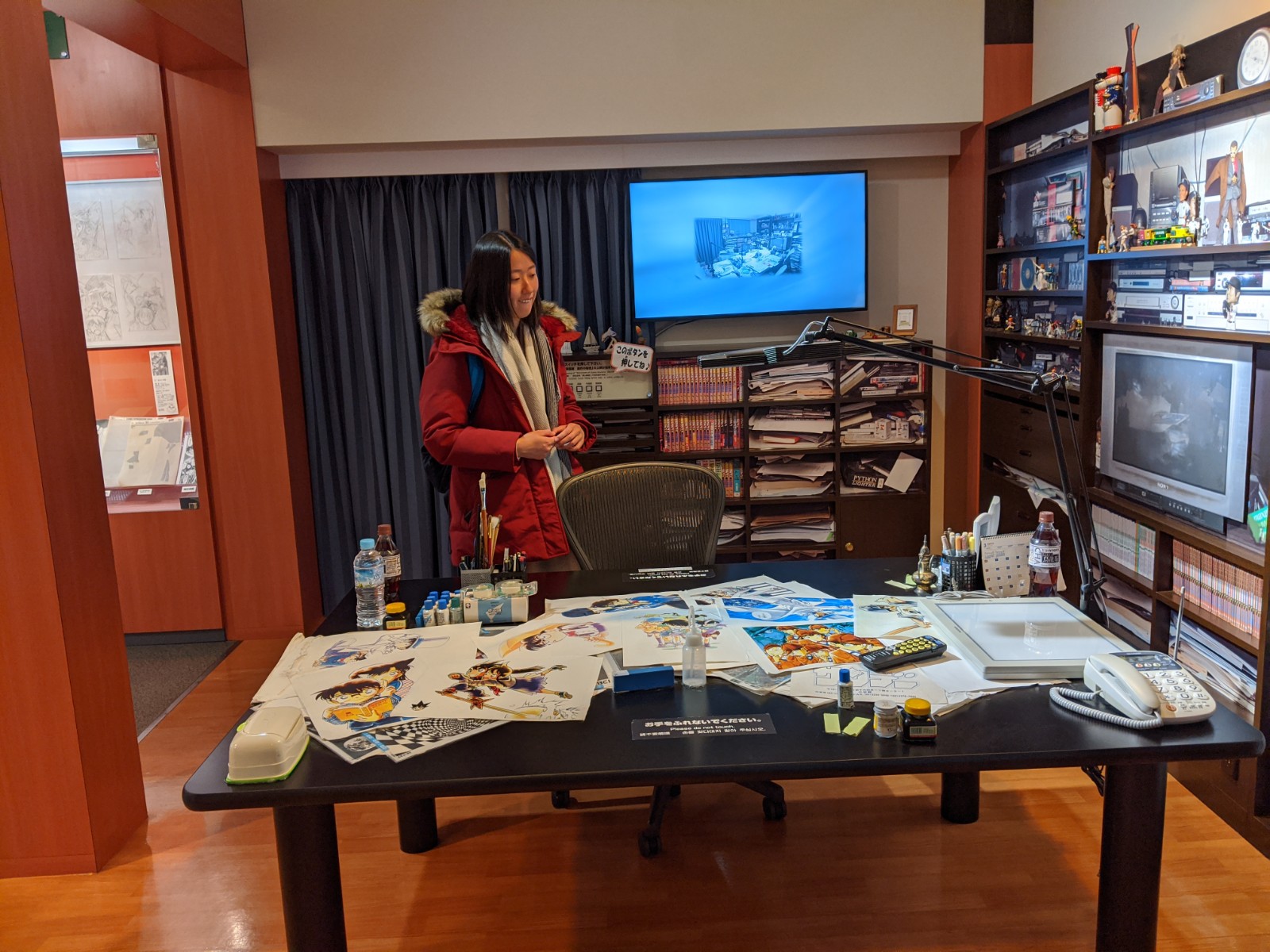 La visite se poursuit avec une reproduction de son bureau de travail, là nous visionnons une autre vidéo de l’auteur nous présentant ses méthodes de travail : le temps pour réaliser ses intrigues, ses storyboard, ses planches finales… Ça reste très intéressant bien que je trouve un peu surprenant de ne pas entendre parler du travail des assistants du mangaka !