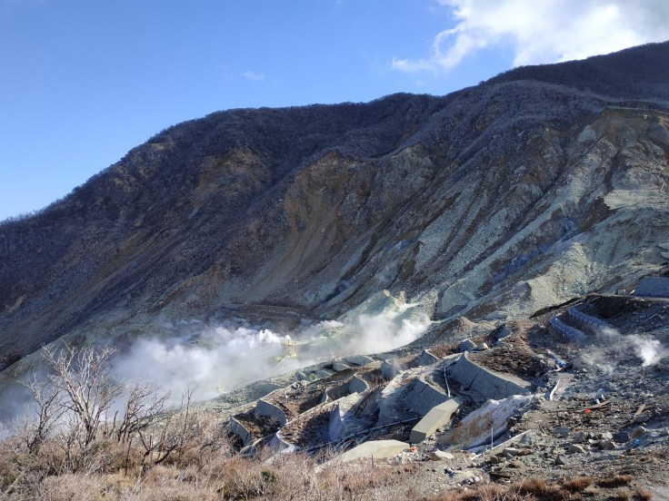 Le téléphérique nous emmène dans une zone à l’activité géothermique forte, ça sent le soufre, ça fume de partout et il y a des panneaux de mise en garde contre les gaz volcaniques tous les 3 mètres. Bienvenue à Owakudani, « la grande vallée bouillante » !