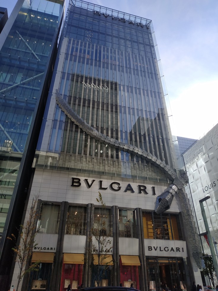Ginza, c’est le quartier du maxi-luxe, là où le mètre carré est le plus cher dans tout Tokyo. Ce n’est pas exactement notre tasse de thé, mais 1) il y a pas mal de bâtiments d’architecture contemporaine funky et je voyage avec une architecte, et 2) c’est là que se trouve Itoya, une papeterie centenaire s’étendant sur plusieurs étages !