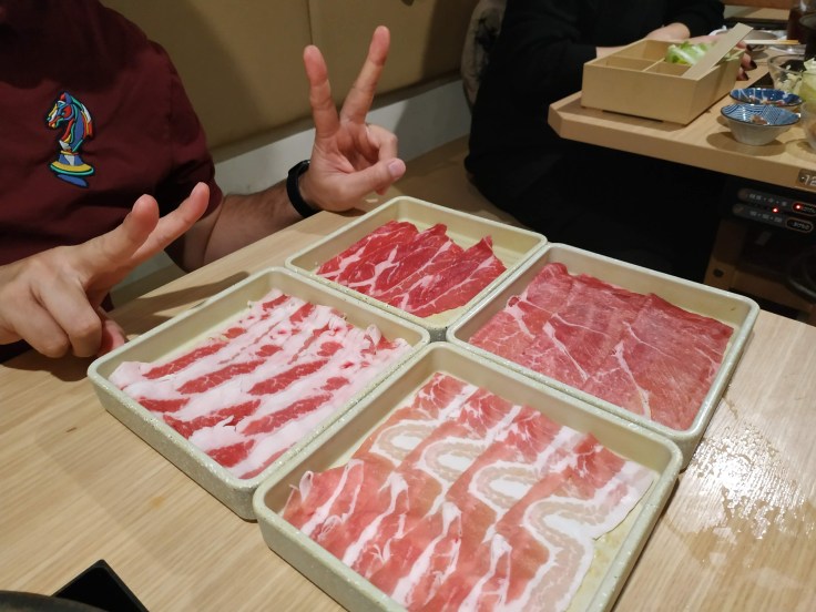 Et le dernier jour, nous avons enfin goûté au shabu-shabu, la fondue japonaise qu’on attendait depuis Kyoto ❤ Le plat se présente en une sorte de marmite avec deux bouillons, dans lesquels ont fait cuire de fines tranches de bœuf, des légumes, des champignons, des nouilles… Un délice.