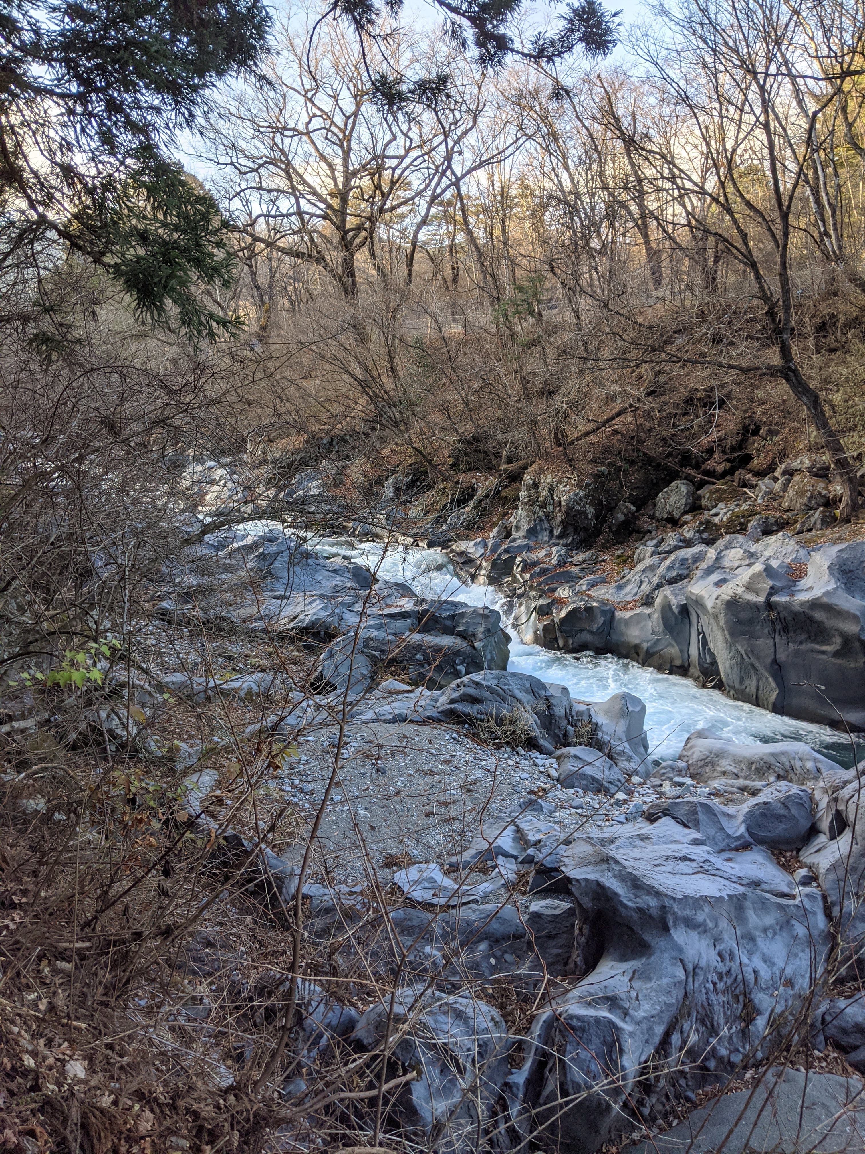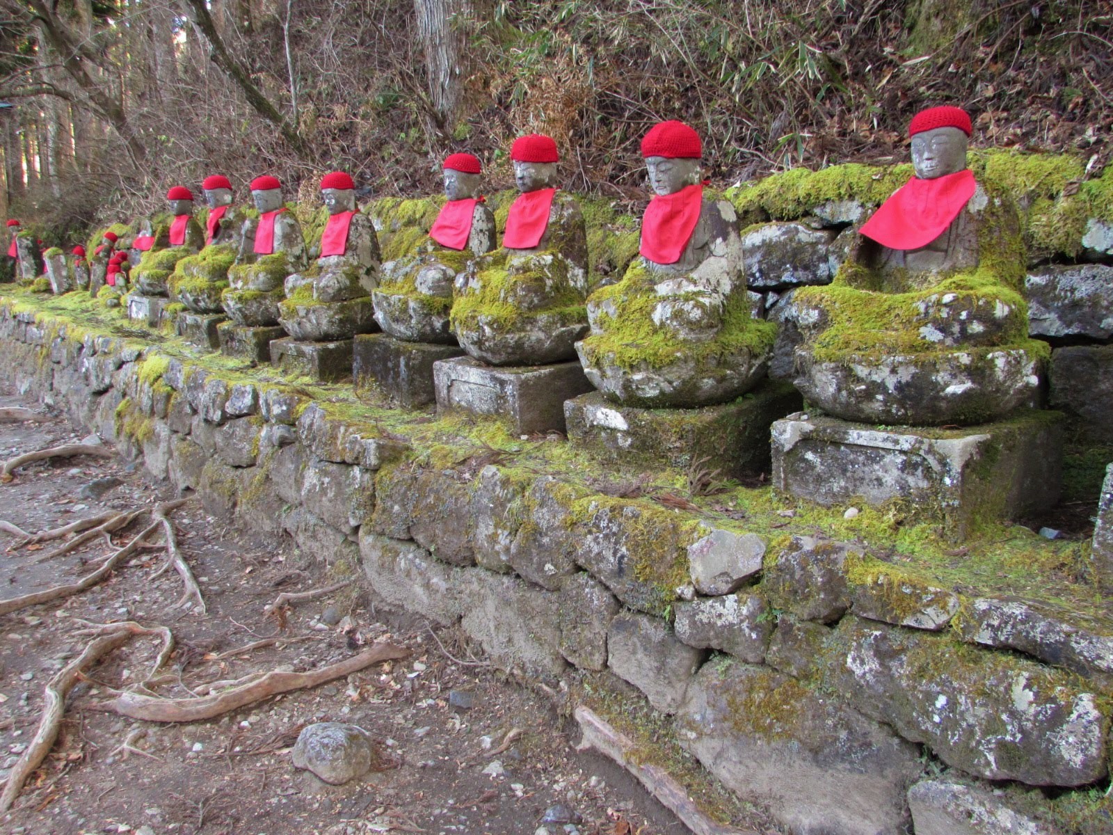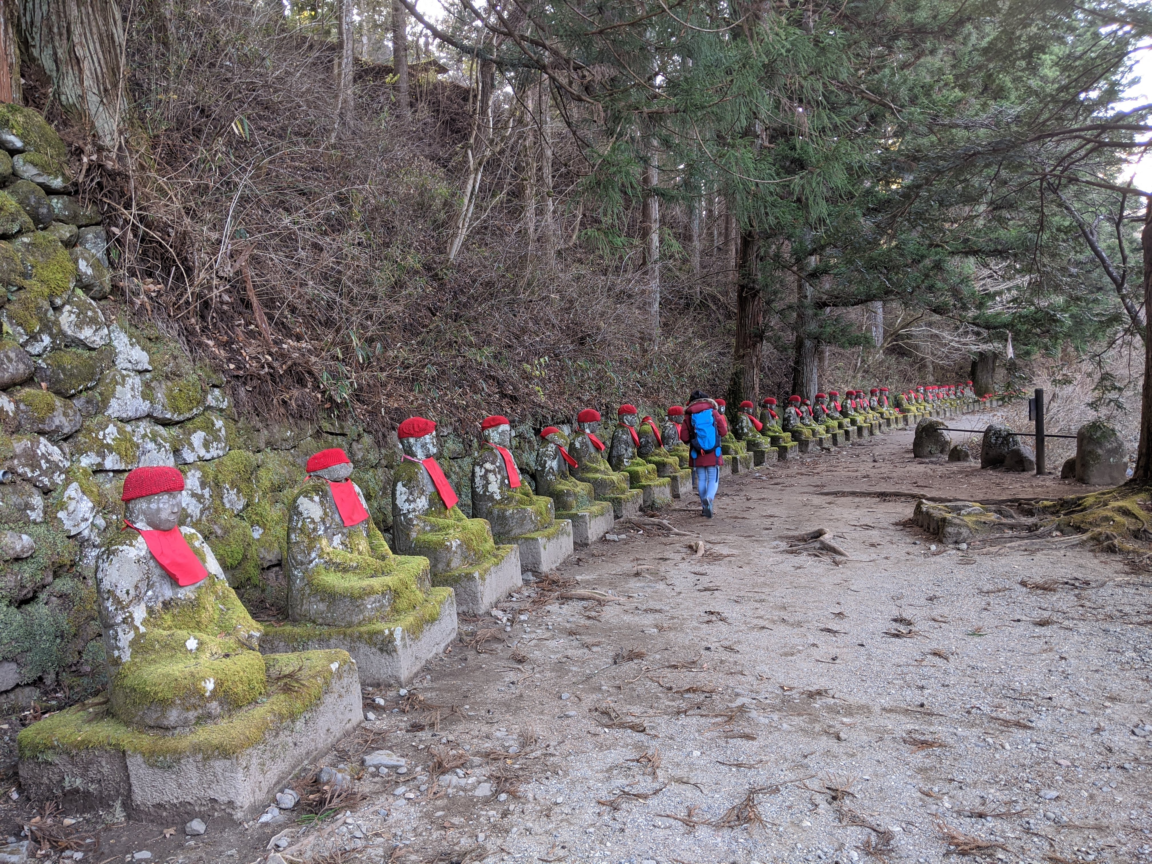 On finit notre journée le long de la rivière Daiya dans un coin appelé Kanmangafuchi Abyss. C’est un sentier un peu caché, manifestement peu connu des visiteurs, et qui serpente le long d’une gorge dans une forêt de cèdres où se trouve une rangée de Jizo (les petits Bouddhas aux bonnets rouges, protecteurs des voyageurs et des enfants). Absolument magique, féérique, encore plus dans la lumière déclinante du soir.