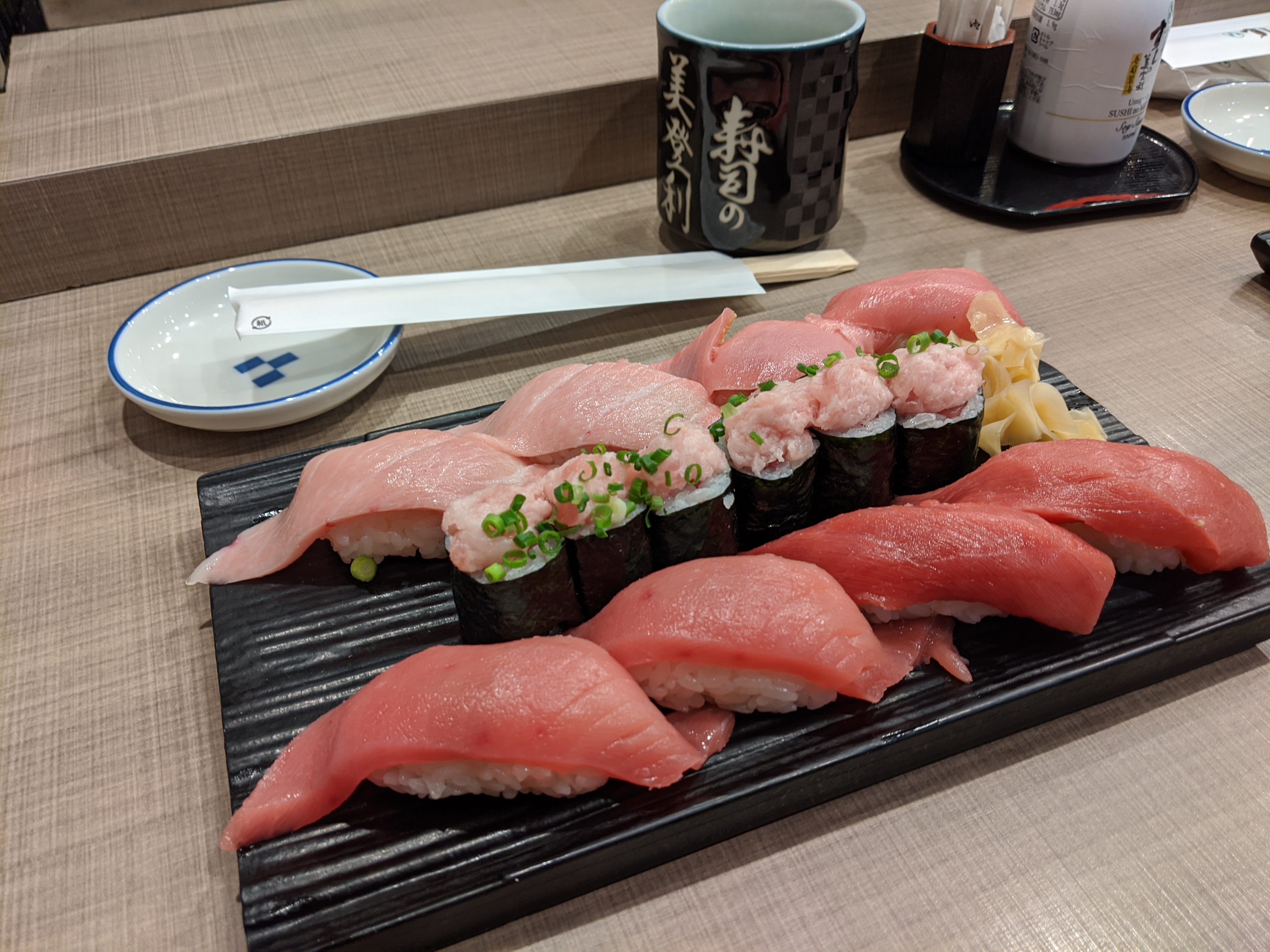 Des sushi, pardi ! On est allées dans un bon resto de sushi (mais abordable), le Midori à Shibuya. Une bonne file d’attente, inévitablement, mais un régal à l’arrivée ! On a notamment pu goûter au « otoro », le thon gras, et bien que ce soit un mets de choix… ben, c’est très gras. Trop gras.