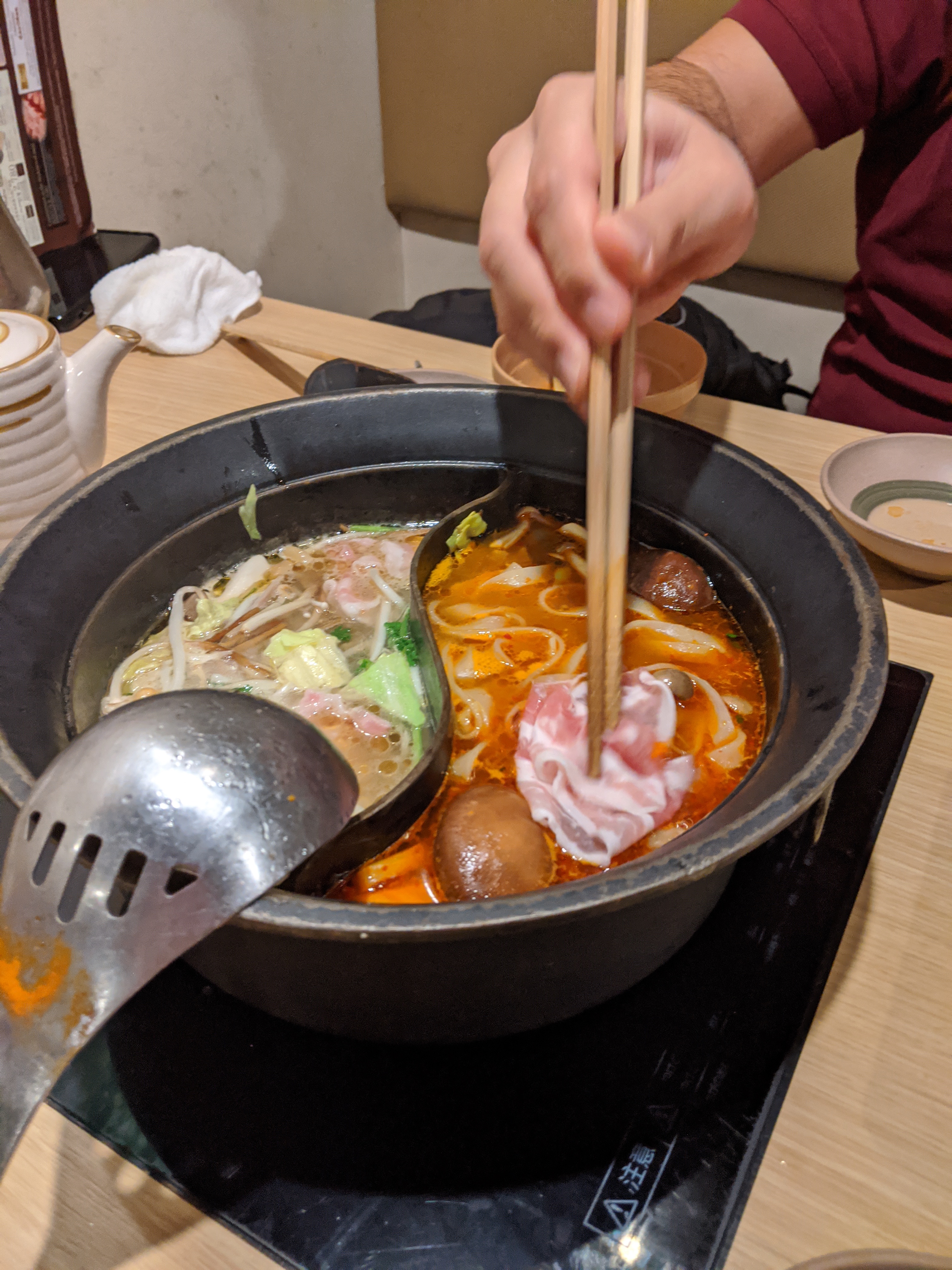 Et le dernier jour, nous avons enfin goûté au shabu-shabu, la fondue japonaise qu’on attendait depuis Kyoto ❤ Le plat se présente en une sorte de marmite avec deux bouillons, dans lesquels ont fait cuire de fines tranches de bœuf, des légumes, des champignons, des nouilles… Un délice.
