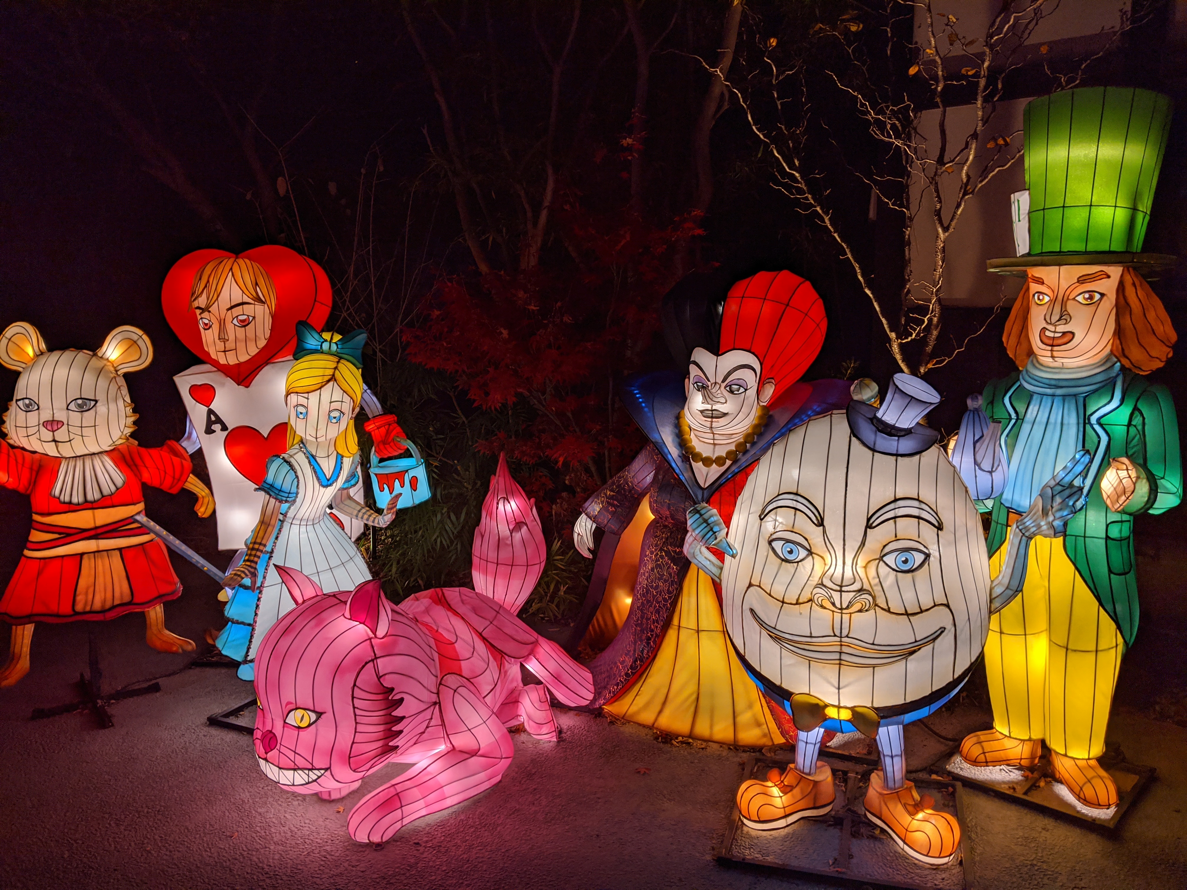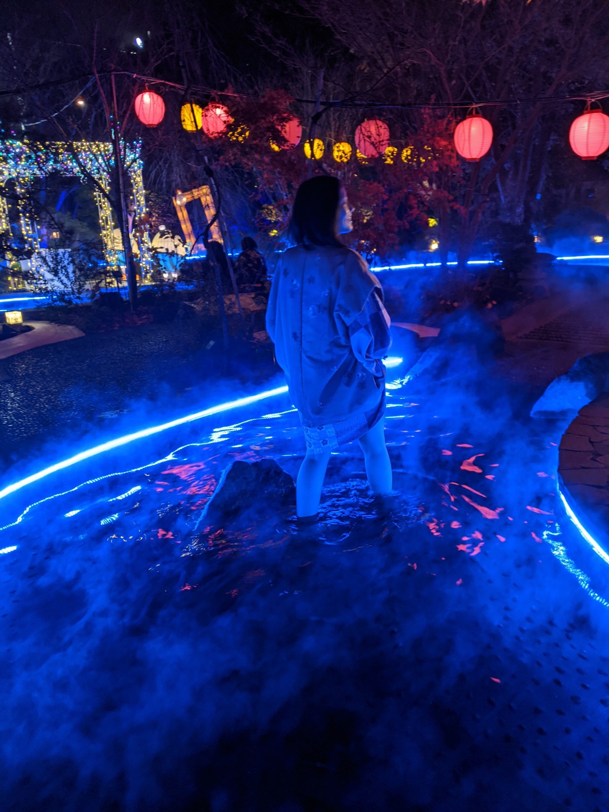 Il y a aussi un joli jardin à l’extérieur avec un bain de pied sous forme de ruisseau qui serpente sous les lumières, le tout dans une ambiance « Alice au pays des merveilles »… Très joli, très poétique, mais par contre, faut avoir des pieds endurcis pour supporter les pierres tranchantes au fond du bassin. Ils sont fous ces Japonais.