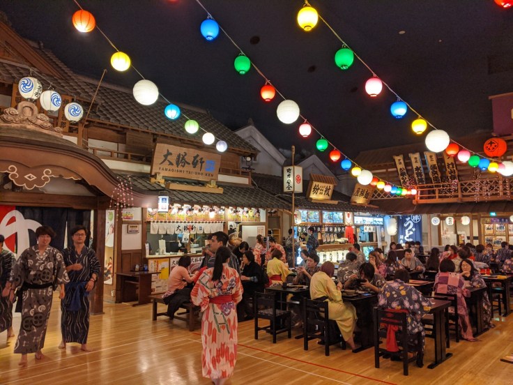 🍙 Oh mais non, attendez ! En fait, ce n’est pas touuut à fait fini : après le shabu-shabu, rien de tel qu’un dernier petit onsen nocturne pour digérer ! Et pas n’importe quel onsen : nous allons à Oedo Onsen, ancré dans un petit village de style ère Edo, dans lequel nous pouvons déambuler en yukata avant d’aller barboter. LE CONCEPT DE GÉNIE.