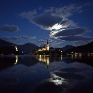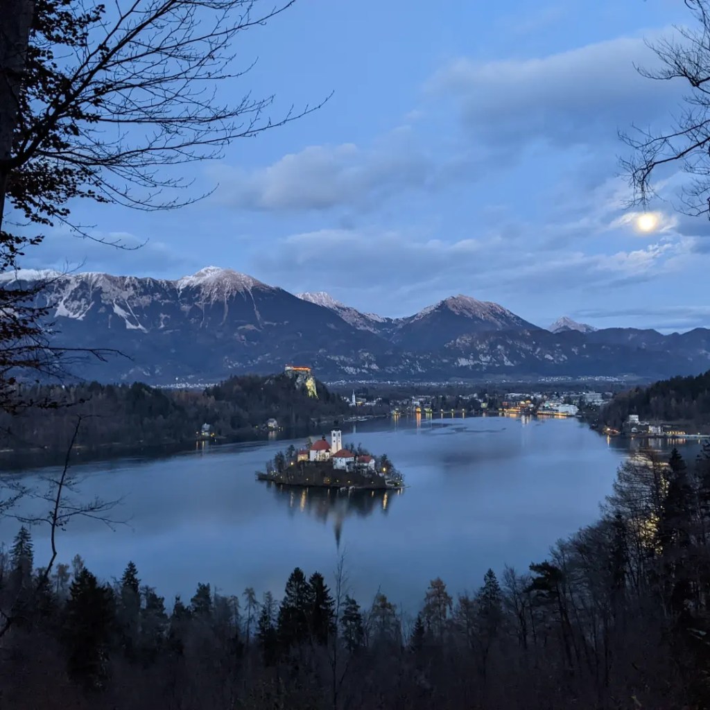 Il y a plusieurs points de vue autour du lac, notamment celui du château (il est apparemment payant, mais on n’est pas allées vérifier). On a plutôt choisi celui de Mala Osojnica, qui fait grimper sur une colline qui offre une vue incroyable sur l’île ET le château. Bonus complètement imprévu : en redescendant, la nuit commençait à tomber et on a eu droit à une pleine lune absolument magnifique juste au-dessus du lac.