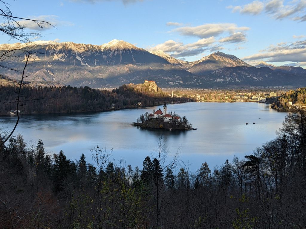 Bled est connu pour son lac entouré de montagnes, au milieu duquel trône une petite île avec une église dessus. Paysage de carte postale par excellence, j’imagine sans problème les foules de touristes en été… Avantage non négligeable de la fin novembre : il n’y a personne (à part quelques irréductibles, mais bon, globalement on se marche pas dessus).