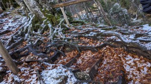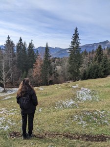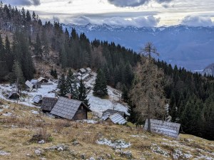 Le lendemain, direction le plateau de Pokljuka pour une rando en forêt direction Planina Zajamniki, un petit village d’alpage tout en bois un peu au milieu de nulle part, avec une vue incroyable sur les Alpes juliennes.