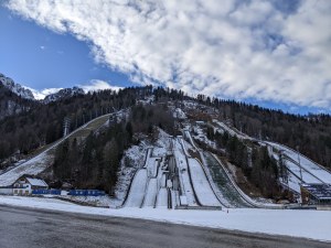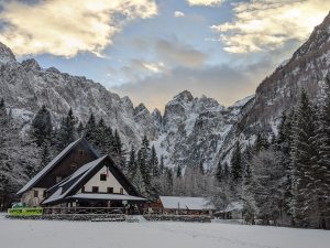 Dernière étape de notre journée : une petite rando pour rejoindre un chalet-refuge avec vue sur le Jalovec, un des plus hauts sommets de Slovénie. Départ d’un autre centre sportif (le Nordijski Center Planica), avec cette fois des tremplins de saut à ski et un parcours pour les entraînements de ski de fond. Décidément.