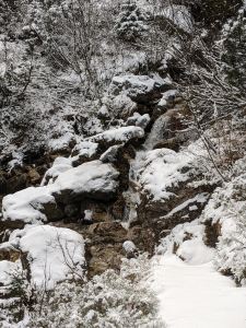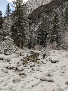 On reprend donc le chemin de retour, en faisant un détour par une (petite) cascade prise dans la neige.